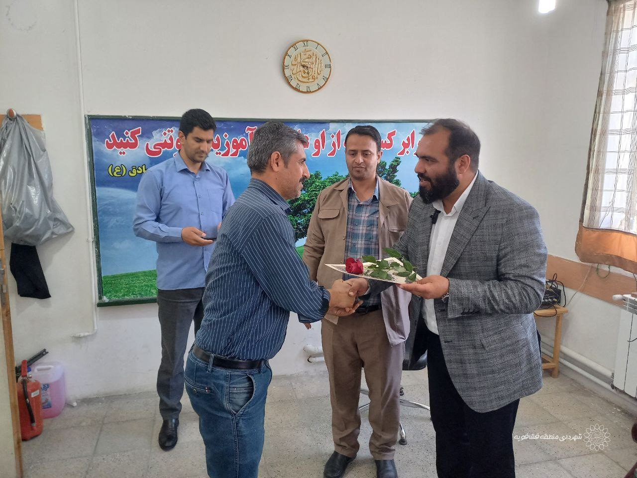 به گزارش روابط عمومی شهرداری وشورای اسلامی شهرحسن آباد: صبح امروز12اردیبهشت ماه همزمان با روز بزرگداشت مقام معلم ، مهندس یعقوبی شهردارحسن آبادبه همراه هادی حسین خانی بخشدار فشافویه ، موسی کاظمی رئیس اداره آموزش و پرورش منطقه فشافویه، شیدوش عضو شورای اسلامی شهر حسن آباد، سروان پایخوان فرمانده حوزه مقاومت بسیج ۴۵۹ شیخ کلینی (ره) و جمعی از مسئولین درمدارس مقاطع مختلف شهرحسن آبادحضوریافتندو این روز بزرگ را به فرهنگیان و معلمان شاغل در شهر تبریک عرض نمودند .