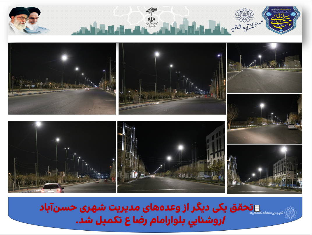 تحقق یکی دیگر از وعدههای مدیریت شهری حسنآباد/روشنايي بلوارامام رضا ع تكميل شد.