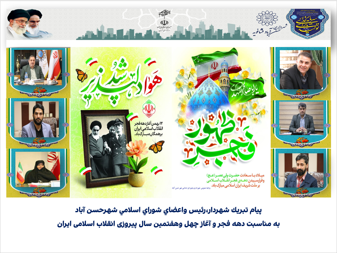 اینجانبان ضمن گرامیداشت یاد و خاطره امام خمینی (ره) و تمامی شهیدان انقلاب اسلامی و دفاع مقدس و آرزوی طول عمر برای مقام معظم رهبری، چهل وهفتمين سا ل پیروزی شکوهمند انقلاب اسلامی ایران را به ملت قهرمان ایران به ویژه شهروندان محترم شهرحسن آبادتبریک و تهنیت عرض مینماییم.