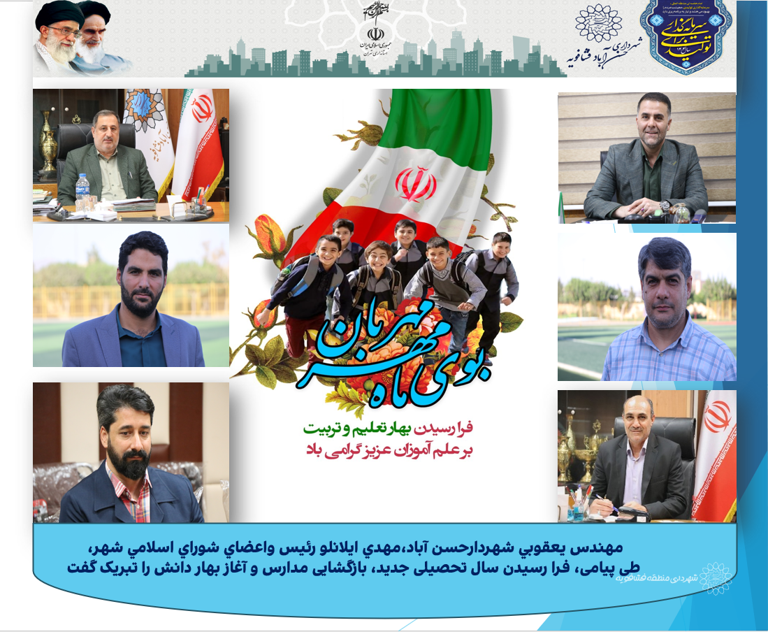 مهندس يعقوبي شهردارحسن آباد،مهدي ايلانلو رئيس واعضاي شوراي اسلامي شهر، طی پیامی، فرا رسیدن سال تحصیلی جدید، بازگشایی مدارس و آغاز بهار دانشادامه مطلب
