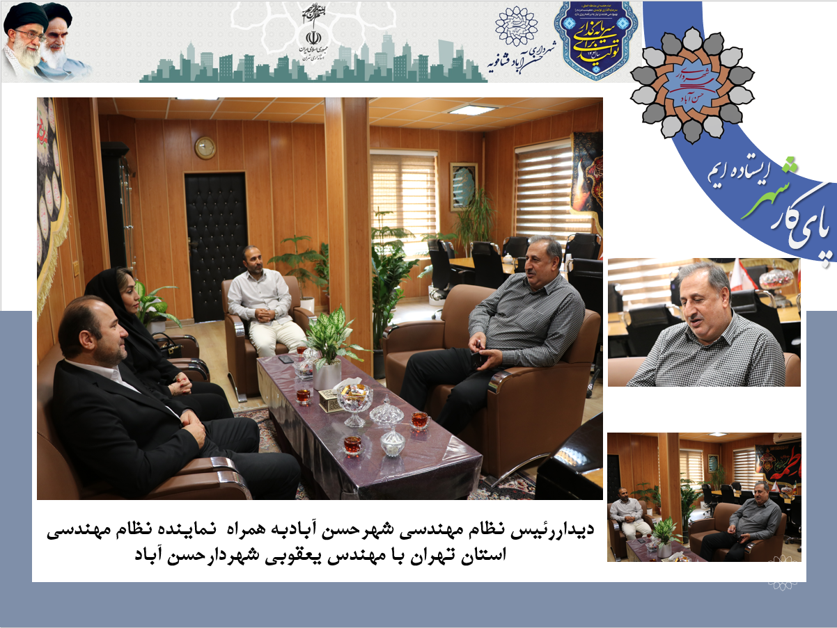 صبح امروز، مهندس سلامی مهر، نماینده نظام مهندسی استان تهران، به همراه سرکار خانم مهندس زارعی، رئیس دفتر نظام مهندسی شهر حسنآباد، با مهندس یعقوبی، شهردار حسنآباد دیدار و گفتگو کردند.