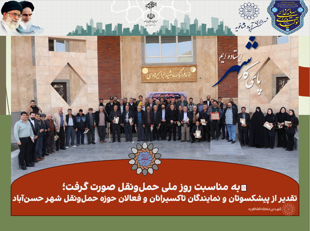 در این مراسم که با حضور مهندس یعقوبی شهردار حسنآباد، مهندس مهدی ایلانلو رئیس و اعضای شورای اسلامی شهر، مهندس رستگاری رئیس اداره محیط زیست شهرستان ری، معصومعلی رئیس شورای اسلامی بخش فشافویه به همراه اعضای این شورا، سرهنگ ساعدی فرمانده پلیس راه حسنآباد، معاونت فرماندهي كلانتري 176 حسن آباد، محمدجواد قمی رئیس سازمان حملونقل و ترافیک شهرداری و جمعی از پیشکسوتان و نمایندگان تاکسیرانان شهر حسنآباد و بخش فشافویه برگزار شد، از تلاشها و خدمات ارزشمند فعالان این حوزه قدردانی به عمل آمد.